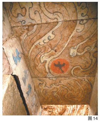 金乌云气画像石(图14)2007年,东平后屯一号壁画墓发现于东平县原县物资局院内,其壁画色彩艳丽、人物形象生动,门楣、前庭立壁及顶部皆绘有彩绘。此画像属墓顶,长5.3米、宽0.96米,以石灰水涂抹于石板作底彩,其上用墨线勾勒轮廓,添彩。画像象征日月天象和天空,整幅画面铺满云气纹,中心绘有一轮红日,红日中有一只三足乌。